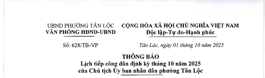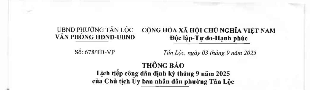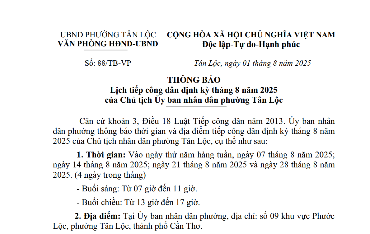 Uỷ Ban Nhân Dân Phường Tân Lộc Thông Báo Lịch Tiếp Công Dân Định Kỳ Tháng 8